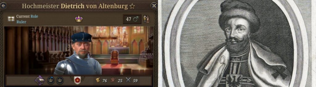 Der Charakter des Deutschordens-Grossmeisters Diedrich von Altenburg, links wie er in Europa Universalis V aussieht, hat gewisse ikonografische Ähnlichkeiten mit seiner retrospektiven, frühneuzeitlichen Kupferstichdarstellung rechts. Bilder: © Paradox Interactive AB und Wikimedia Commons