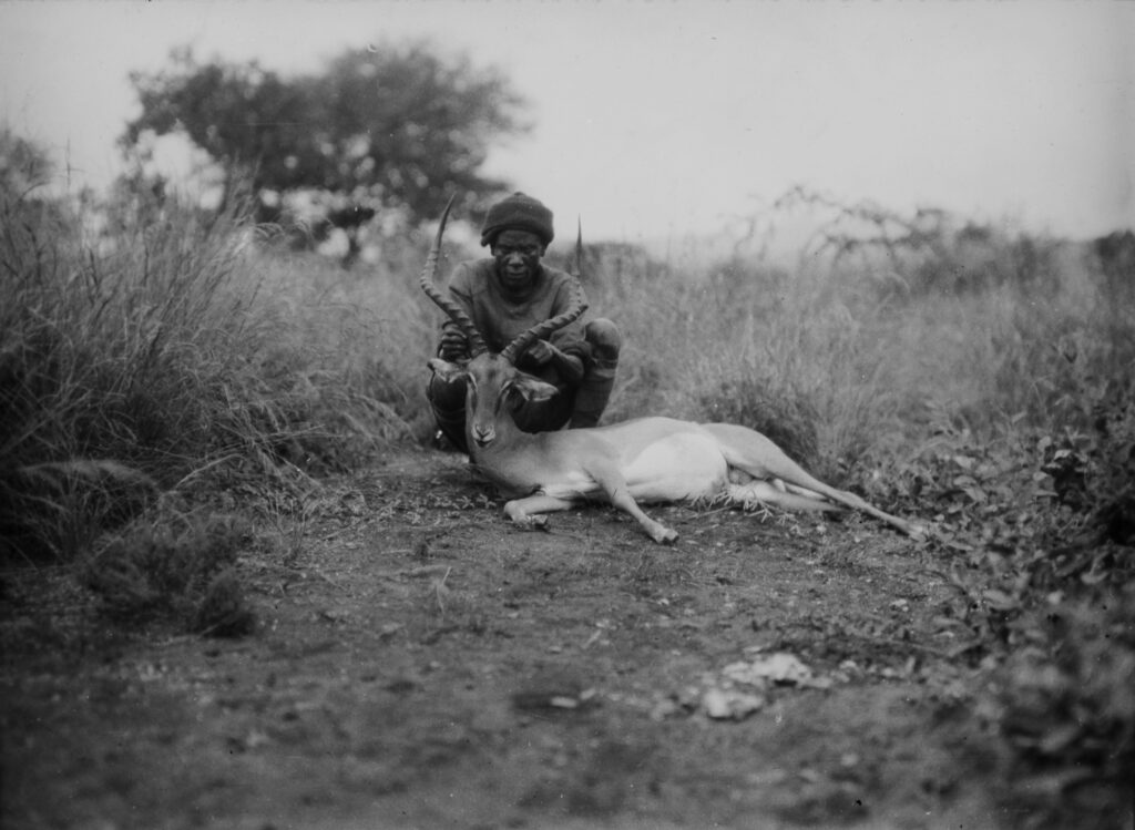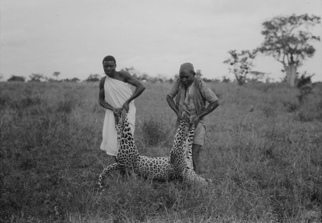 Weniger romantisch waren die langen Fussmärsche für die angeheuerten Träger, die den gesamten Hausrat der von Wattenwyls, von Konservenbüchsen, Kopfkissen und Liegestühlen bis hin zu Zigaretten und einem Tisch für die tea time, Zelte, Gewehre sowie die getrockneten Häute und Knochen der erlegten Tiere in Kisten trugen. Auch ein Koch, mehrere «Häuter», Spurenleser, Gewehrträger und ein Dolmetscher begleiteten die beiden Europäer:innen auf ihrer Reise. Männer wie sie sind in der öffentlichen Erinnerung an koloniale Safaris bis heute mehr oder weniger abwesend. Stattdessen dominiert das Bild des weissen Grosswildjägers als mutiger Alleingänger. Geprägt wurde dieses insbesondere durch Fotografien, auf denen sich die Jäger stolz neben erlegten Büffeln und Antilopen ablichten liessen.